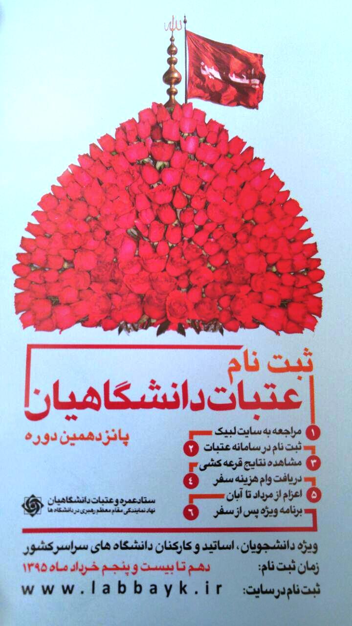 ثبت نام عتبات دانشگاهیان ویژه دانشجویان ، اساتید و کارکنان دانشگاه های سراسر کشور، ثبت نام از تاریخ دهم تا بیست و پنجم خرداد ماه 1395 انجام می گیرد