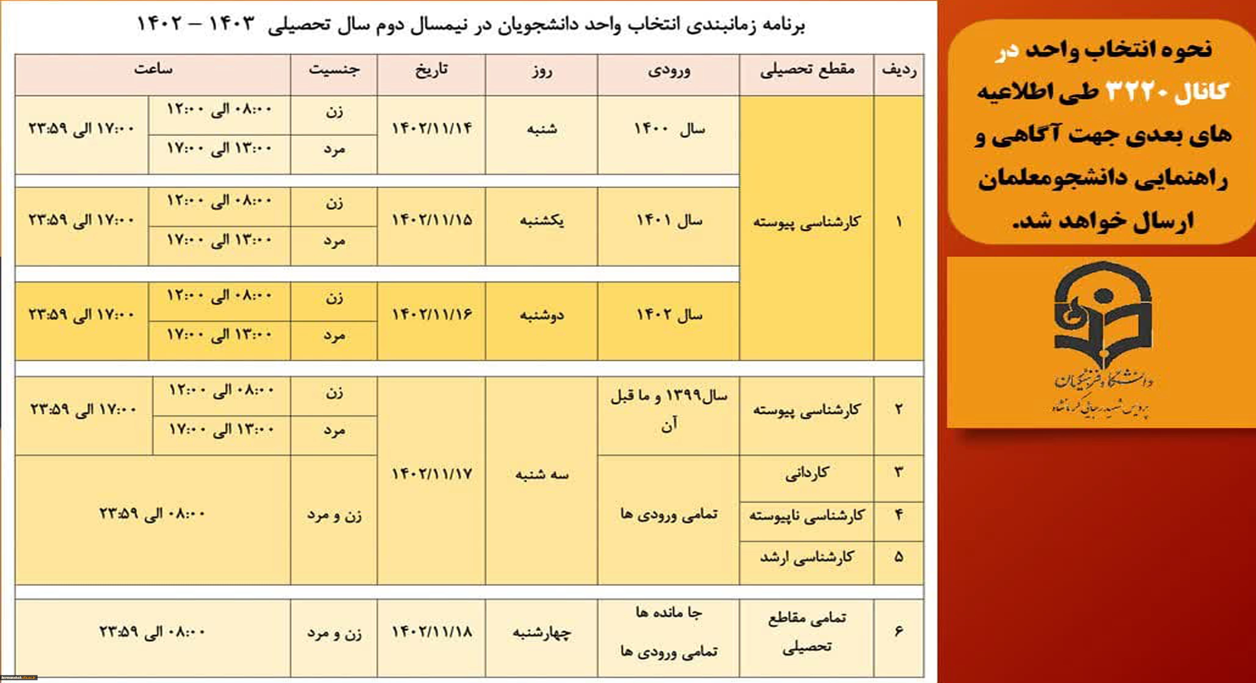 امتیاز دهید : جدول زمانبندی انتخاب واحد دانشجو معلمان پردیس شهید رجایی- نیمسال دوم 1403-1402 2 جمعه 13 بهمن 1402 ساعت 18:45