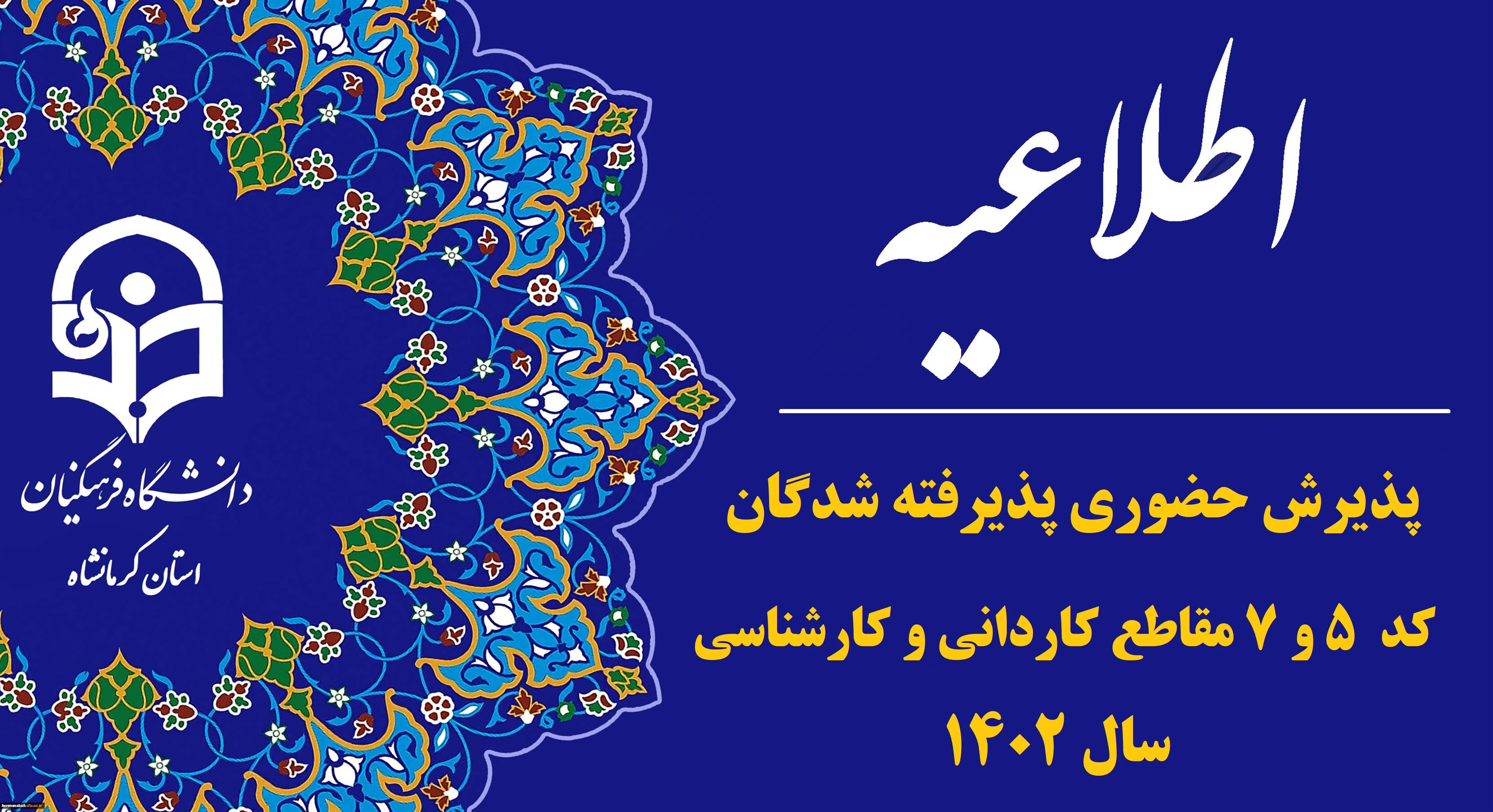 امتیاز دهید : اطلاعیه پذیرش حضوری پذیرفته شدگان کد ۵ و ۷ در مقاطع کارشناسی و کاردانی سال ۱۴۰۲ 2 شنبه 21 بهمن 1402 ساعت 13:42