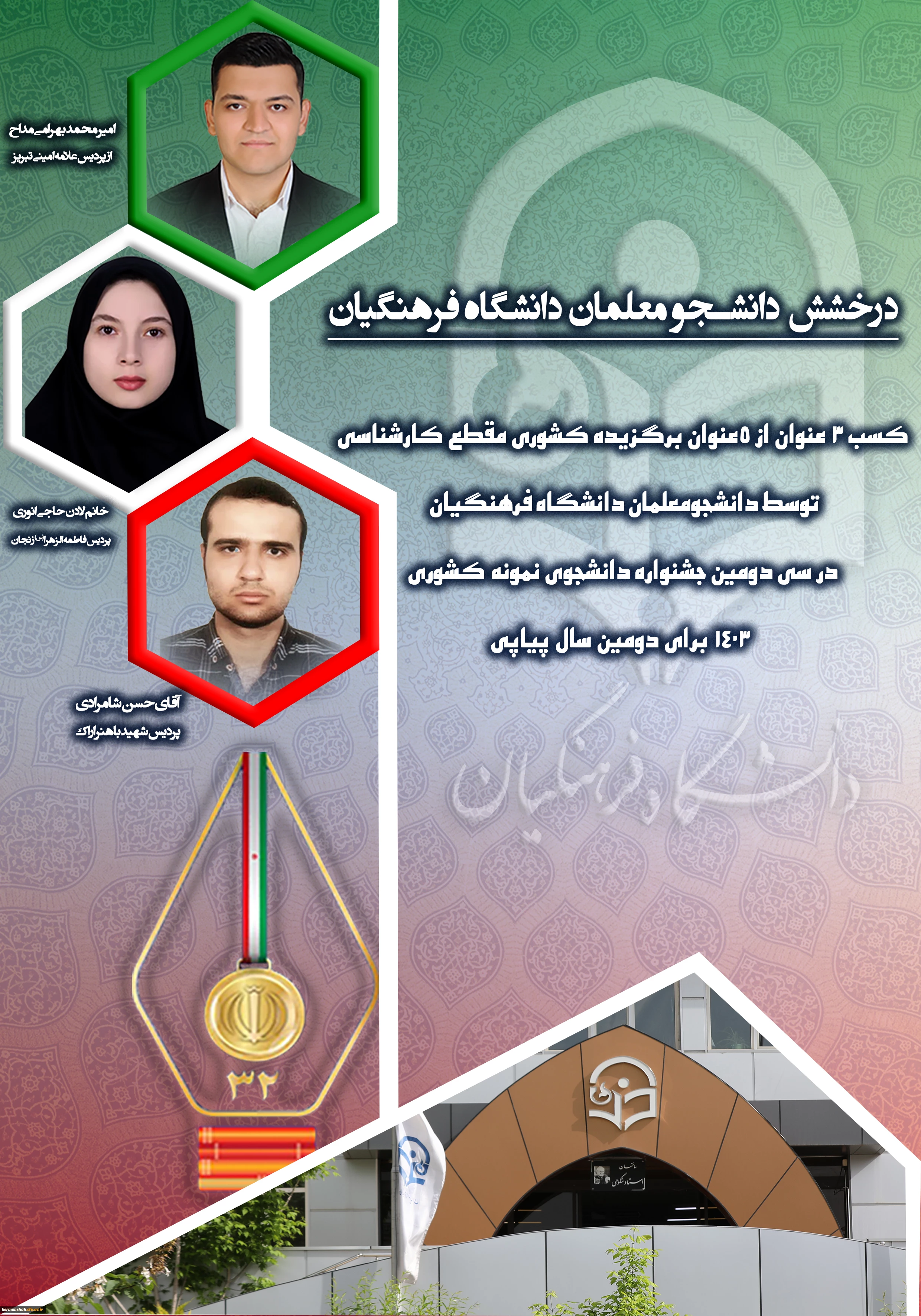کسب ۳ عنوان از ۵ عنوان برگزیده کشوری مقطع کارشناسی توسط دانشجومعلمان دانشگاه فرهنگیان در سی و دومین جشنواره دانشجوی نمونه کشوری ۱۴۰۳ برای دومین سال پیاپی 2